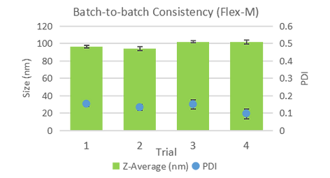 批次间差异是传统批量制备方法的主要问题。借助先进的微流体技术,PreciGenome NanoGenerator 系统可以生成高度一致和可重复的结果,并减少批次间的差异。在配方和合成参数固定的情况下,来自 Flex-M 的四 个单独样品在 PNP 尺寸和 PDI 方面产生了非常相似的结果,尺寸变化约为 5%,PDI 约为 0.15